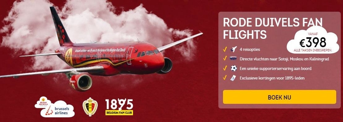 Brussels Airlines biedt ook speciale vluchten aan vanaf Zaventem naar de speelsteden van de Rode Duivels. Deze vluchten zijn inclusief alle taksen en voorzien van een unieke supporterservaring aan boord. Vergelijk de mogelijkheden via: